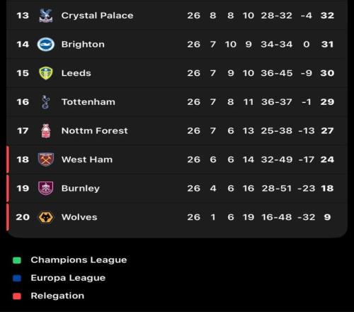 英超保级形势骤变!五支球队深陷降级区两队紧急换帅